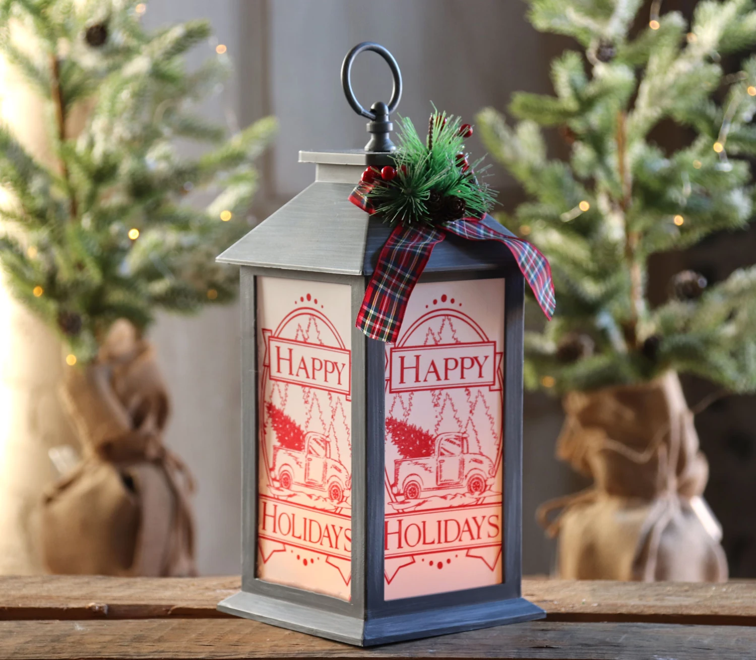 13 Inch Christmas lantern with frosted panes, a Christmas scene with a truck carrying a tree home for the Holidays, decorative greenery also features a three way switch: Steady On, Fire Effect and Off.