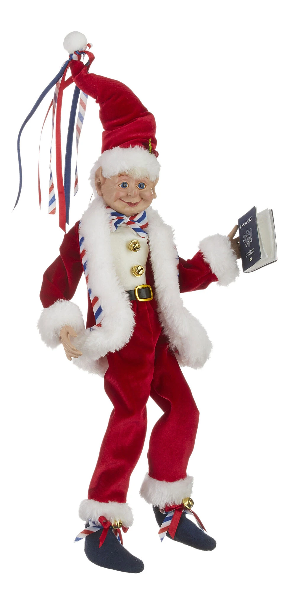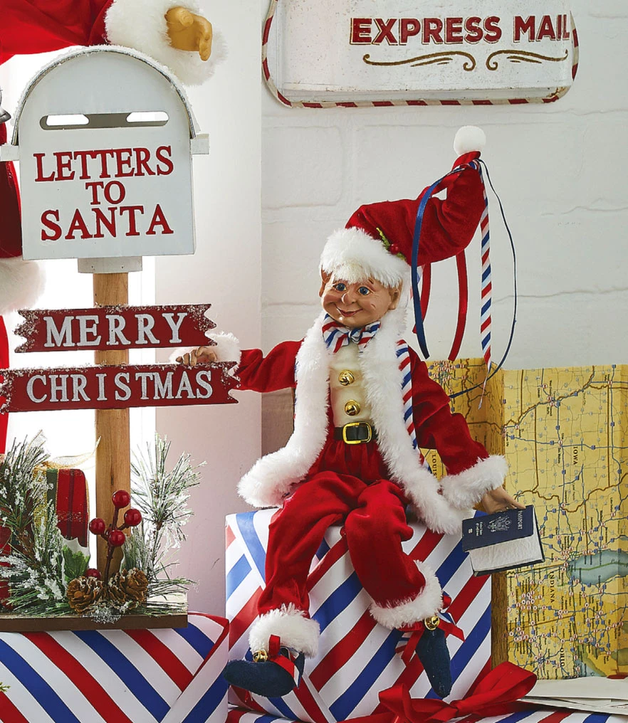 Dressed in red and white Santa outfit lined with fur, brass bell buttons, red white and blue streamers ready for travel.