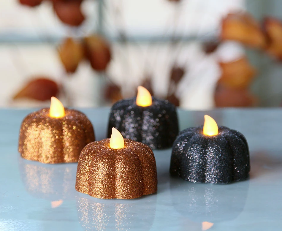 Battery Operated Pumpkin LED Tealights Set of 4 are perfect for your fall holiday season. Add to your Halloween or Thanksgiving decorations, parties, tabletop or mantle. The amber colored flame with 2 orange glitter and 2 chocolate glitter pumpkin tealight glow bright, are windproof and will last thousands of hours. On – Off switch is located on the bottom.