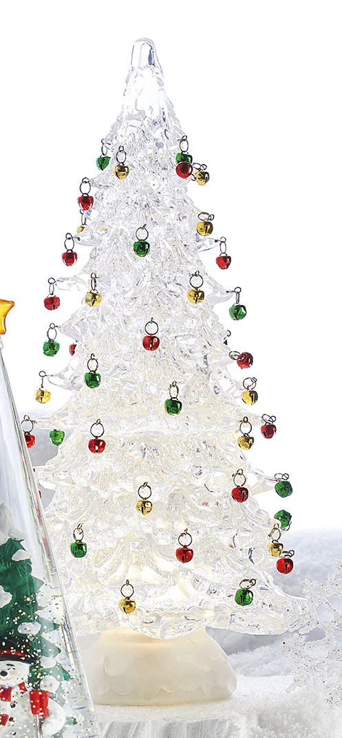 The simplicity of our new Acrylic Tree with Red Green and Gold Ornaments Lighted Water Lantern with Continuous Swirling Glitter with a white base and warm white LED.