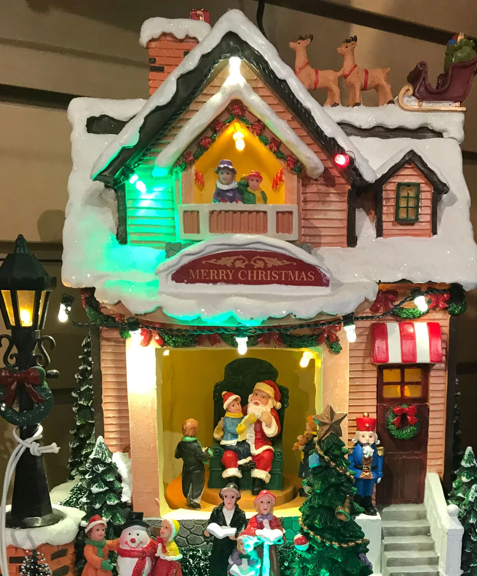 Musical Animated Christmas Holiday house – With Sound and Motion 10.6 Inch. Inside is Santa sitting in a chair, a child with their list on his lap while others circle around them with motion. Outside a variety of multi color lights. A lighted lamp post, children gathering around a snowman, carolers, and Santa’s sleigh and reindeer on the rooftop.