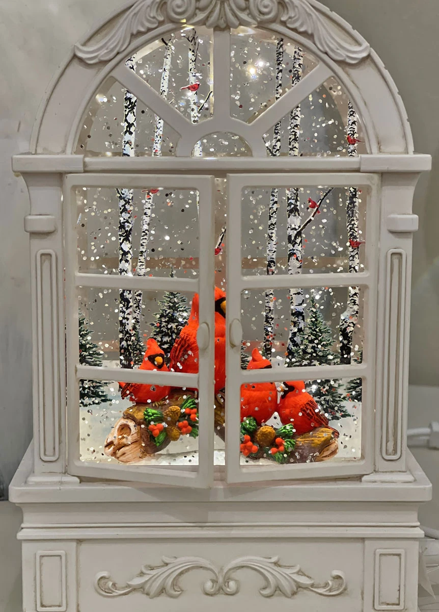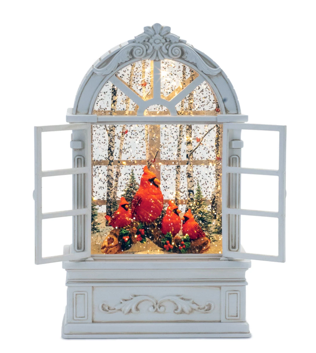 This delightful Window Pane Arched Lighted Snow Globe will bring seasonal joy to any home. Its intricate design features a grouping of cardinals perched on a branch with holly. A background scene features birch trees filled with cardinals. It comes with a USB cord, making it easy to power the lighted snow globe. Perfect for Christmas and winter decor. Window open and close, what a great feature!