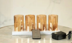Rechargeable Moving Flame Set Of 4 Gold Glass Votives With Charging Base And Remote