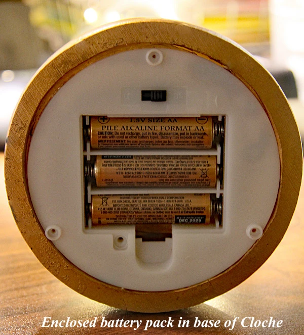 With the batteries located in the wood base, there are no wires or battery packs to hide or hang out the back of the cloche.