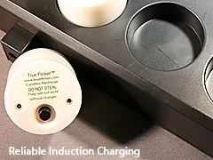 Remote control Warm White commercial quality flameless tealights for heavy, everyday use in the restaurant, catering and hospitality industry. Inductive charging base avoids all pins, prongs or bothersome slots to line up. Just drop the tealights into their charger holes. Eight hours later they are ready for 12 to 14 hours of service. Nothing on the market is easier to use, faster or better made.
