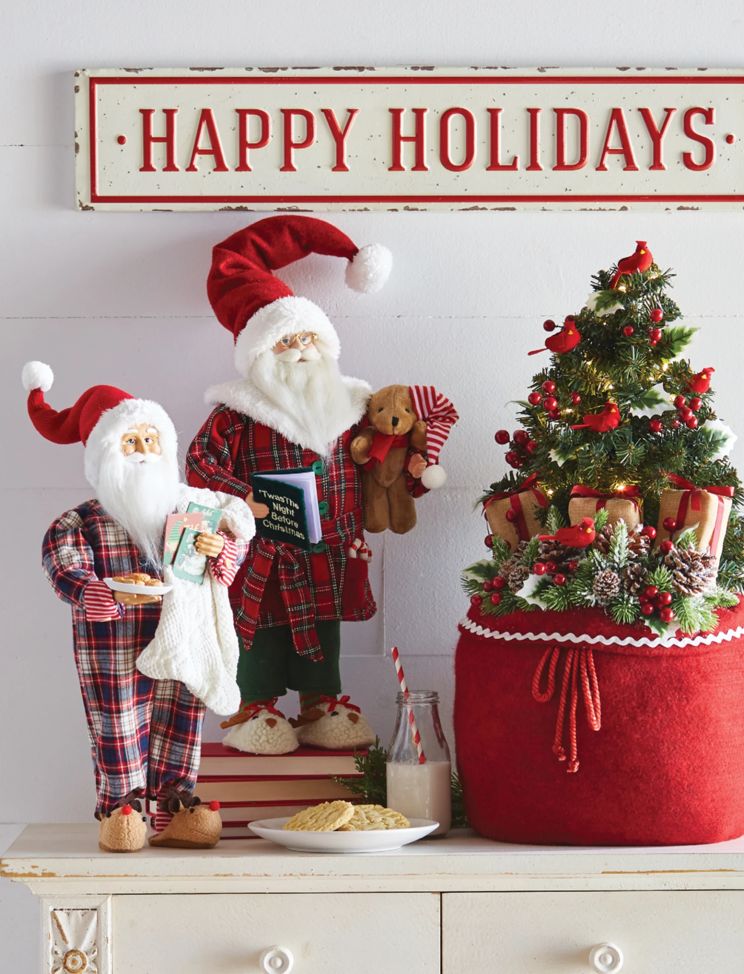 24 Inch tall red bag tied with red rope and white zig zag detail. Inside an evergreen tree with lights, red berries, pine cones wrapped presents with red ribbon and lots of red cardinals.