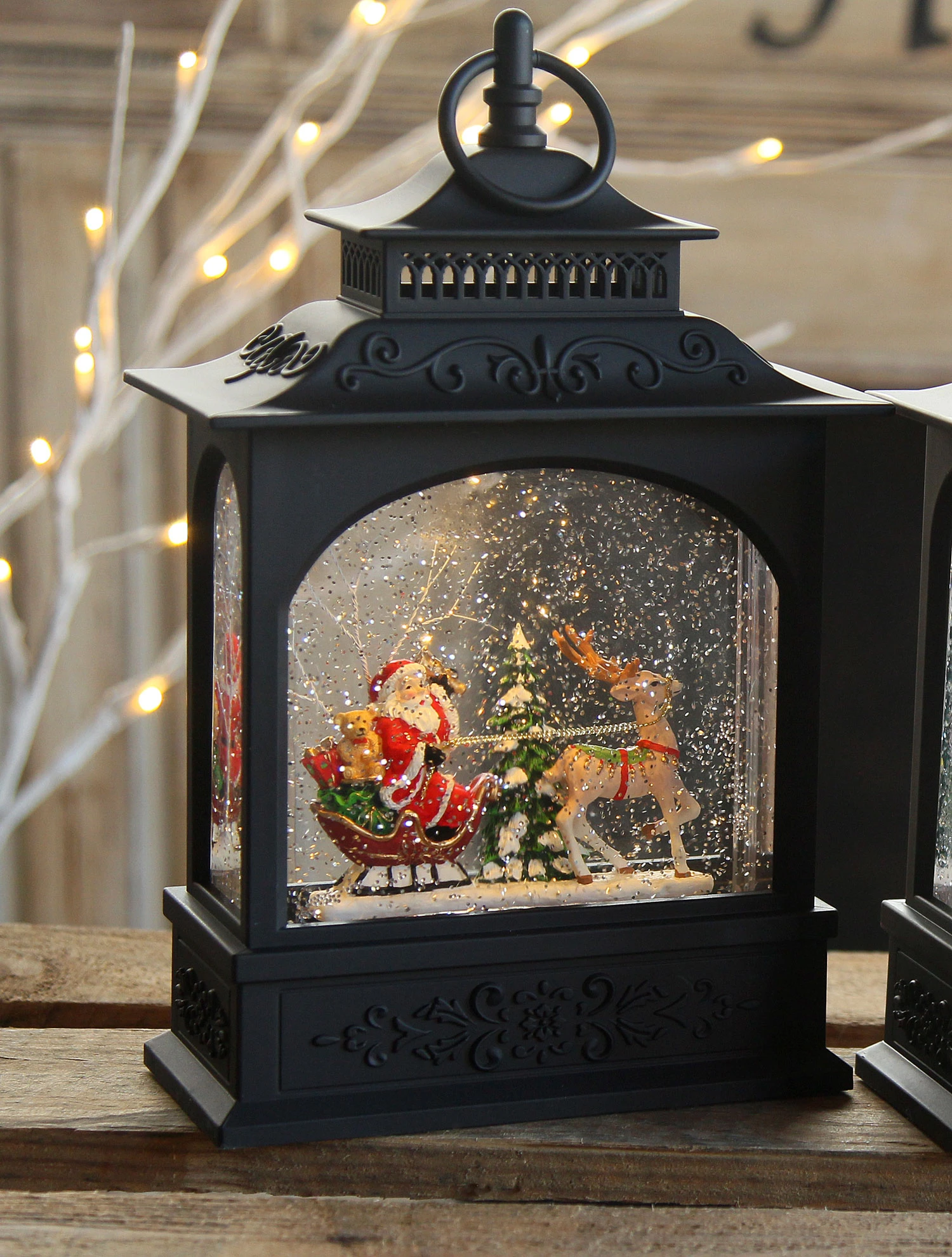 Battery operated picture window water lantern featuring Santa driving his reindeer pulled sleigh with swirling glitter.