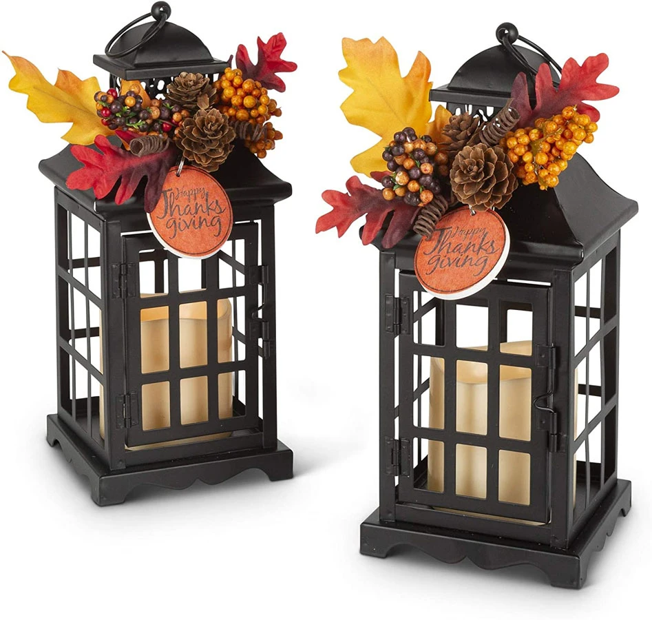 Set of 2 Metal Fall lanterns with LED candle. 6 Hour Timer. Fall Floral accents include pine cones, fall berries, colorful fall leaves and a Happy Thanksgiving hang tag. The panels of the lantern are open. No glass or plastic to break or obstruct the view of the LED candle. Comes in a decorative carrier.