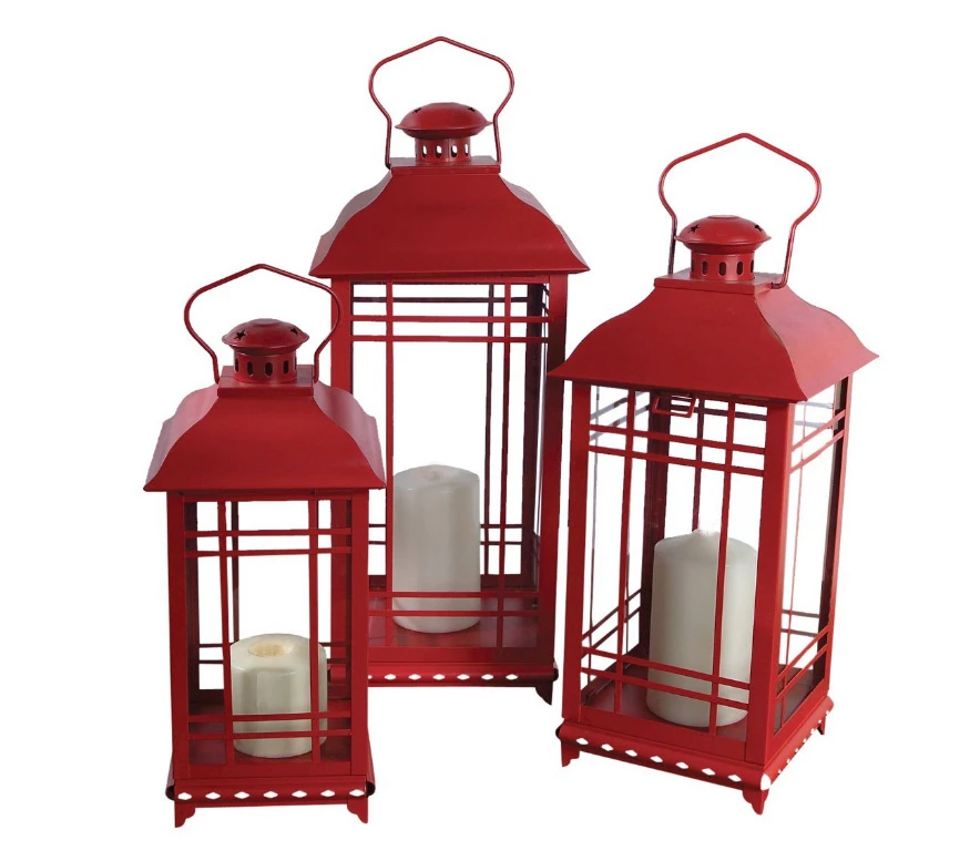 Set of 3 red metal lanterns, 14, 17 and 20 Inch Tall. Crafted of metal and glass, our lantern brings the sparkle and warmth of candlelight to your home. Use on your tabletop, cabinet, or as a decorative lamp next to your fireplace.