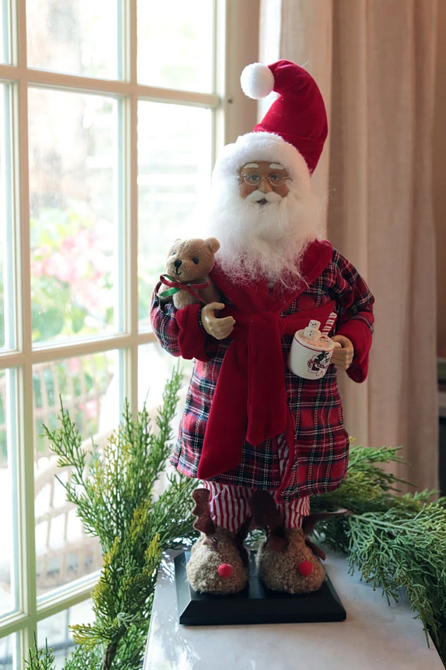 - Wearing striped pajamas, plaid robe carrying his teddy and cup of cocoa